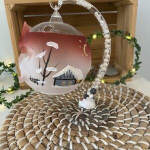 Boule de Noël en verre suspendue pour bougie chauffe-plat style photophore Pied en verre Fait main Décor village enneigé Diametre de la boulle 13 cm
