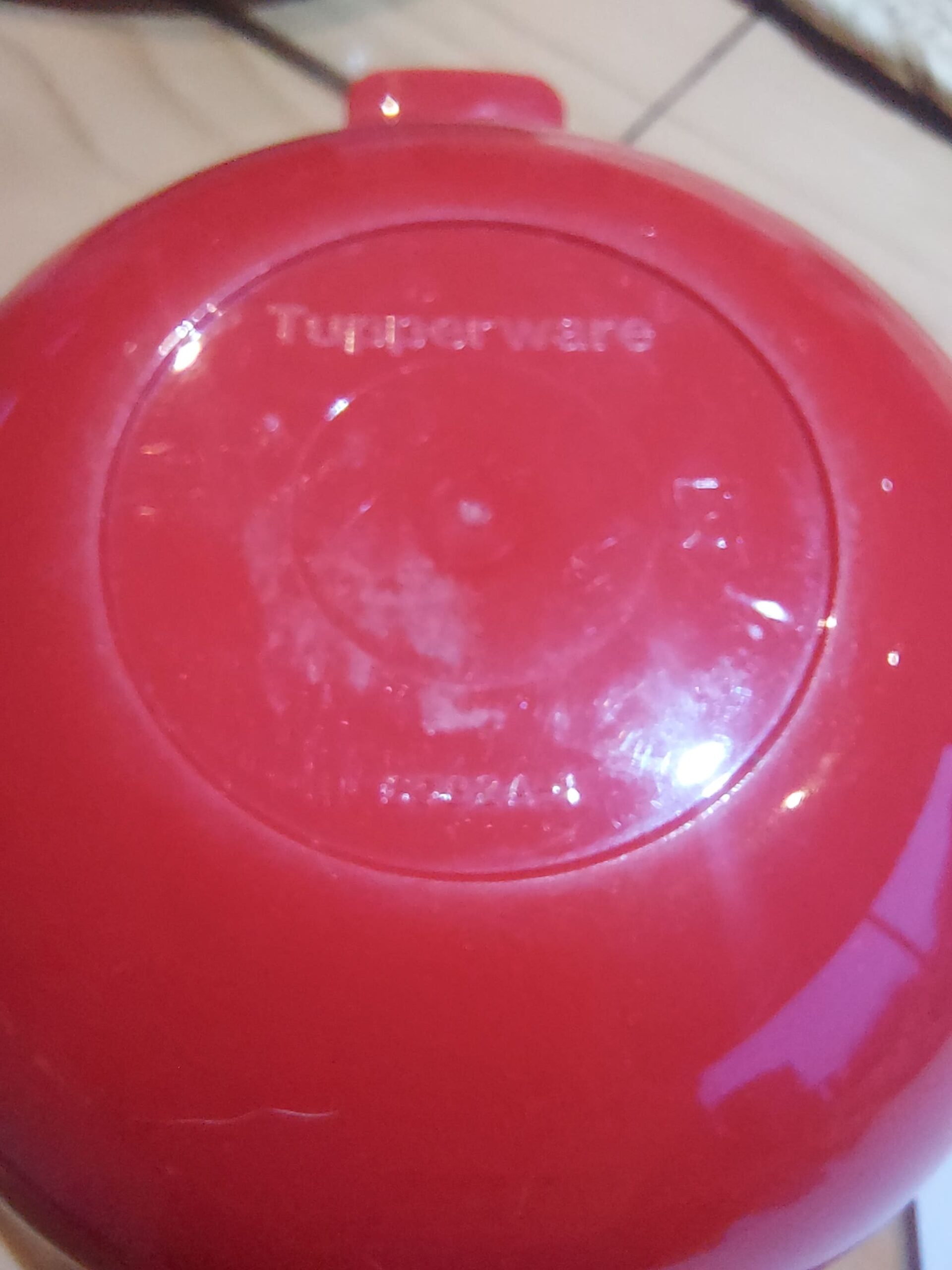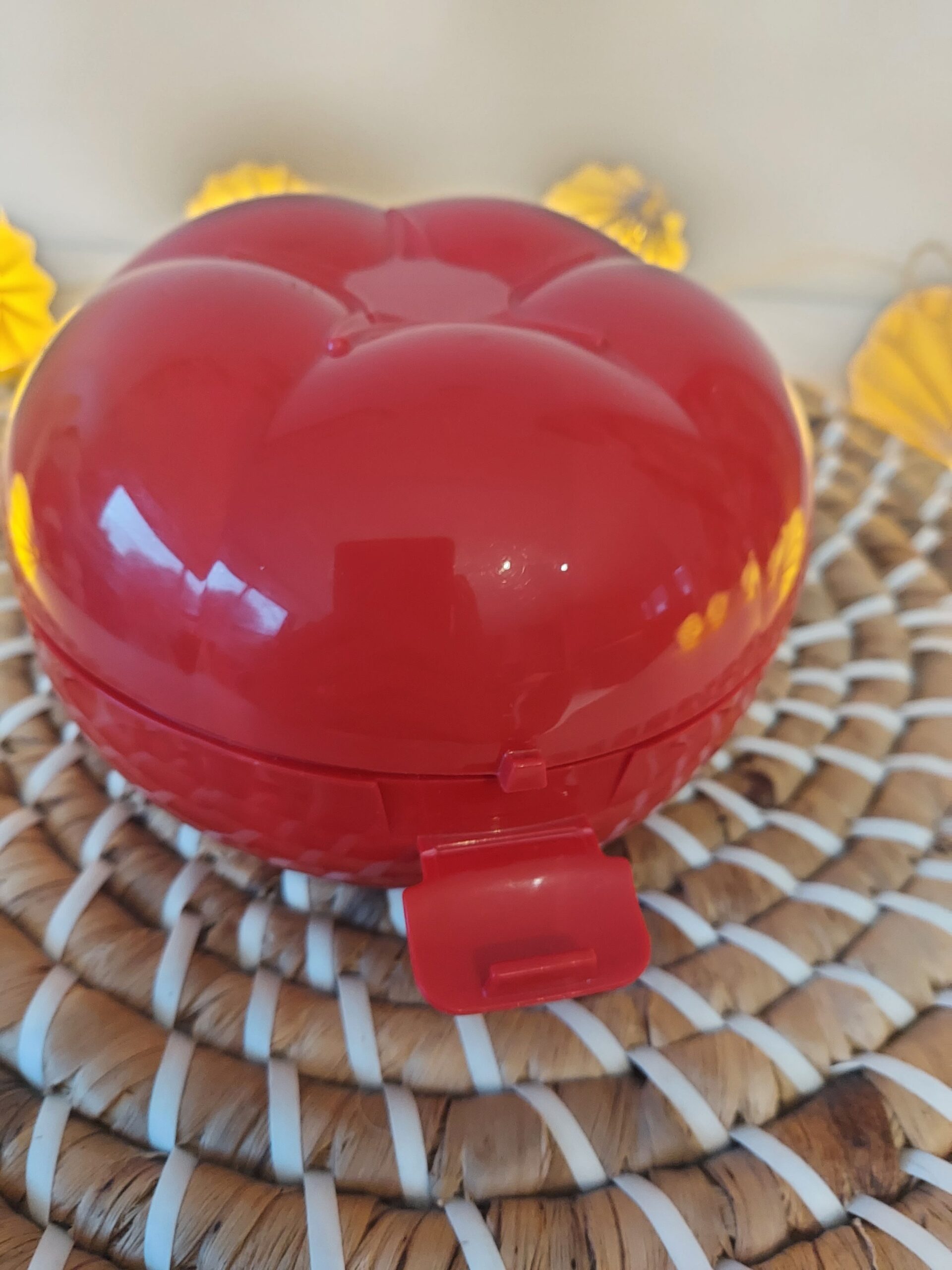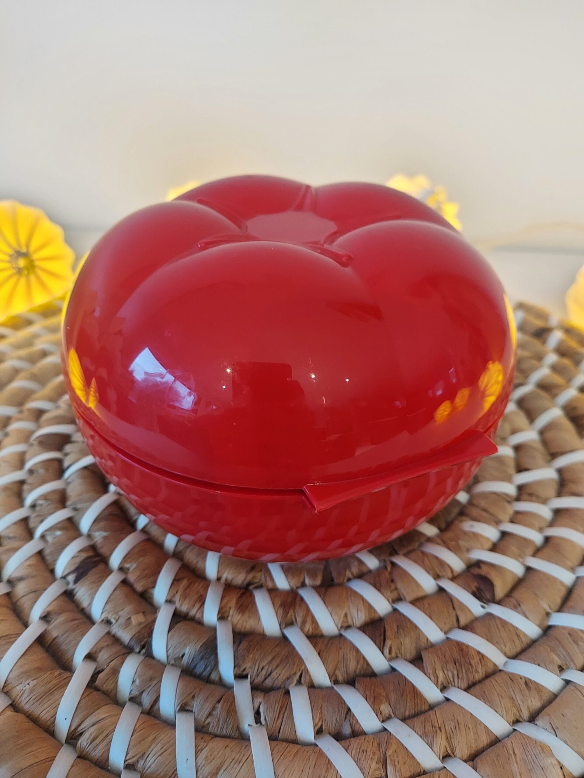 Boite Tupperware en forme de tomate en plastique rouge avec couvercle charnière clip sur le côté vintage années 80 Modèle 6582A-1