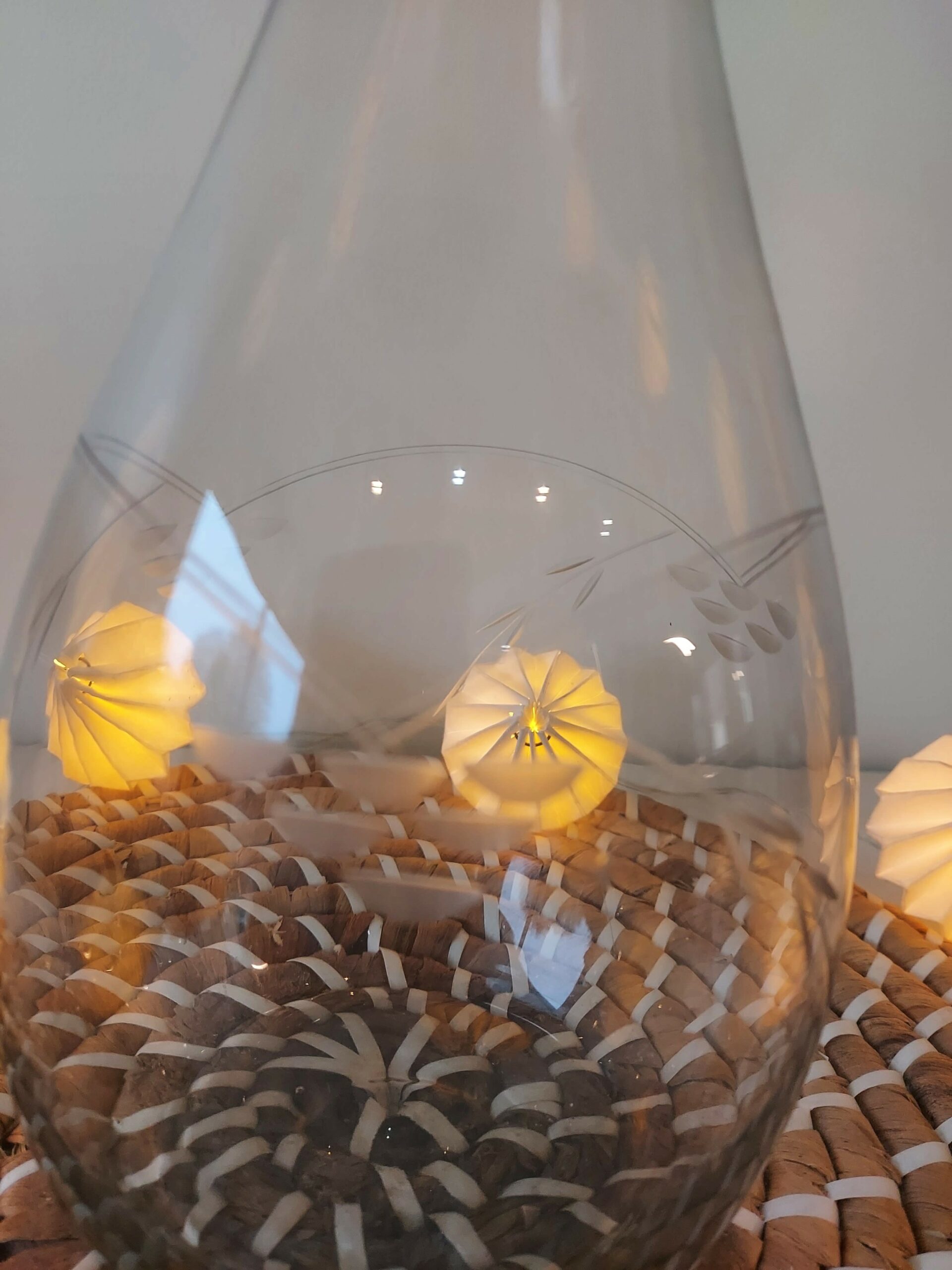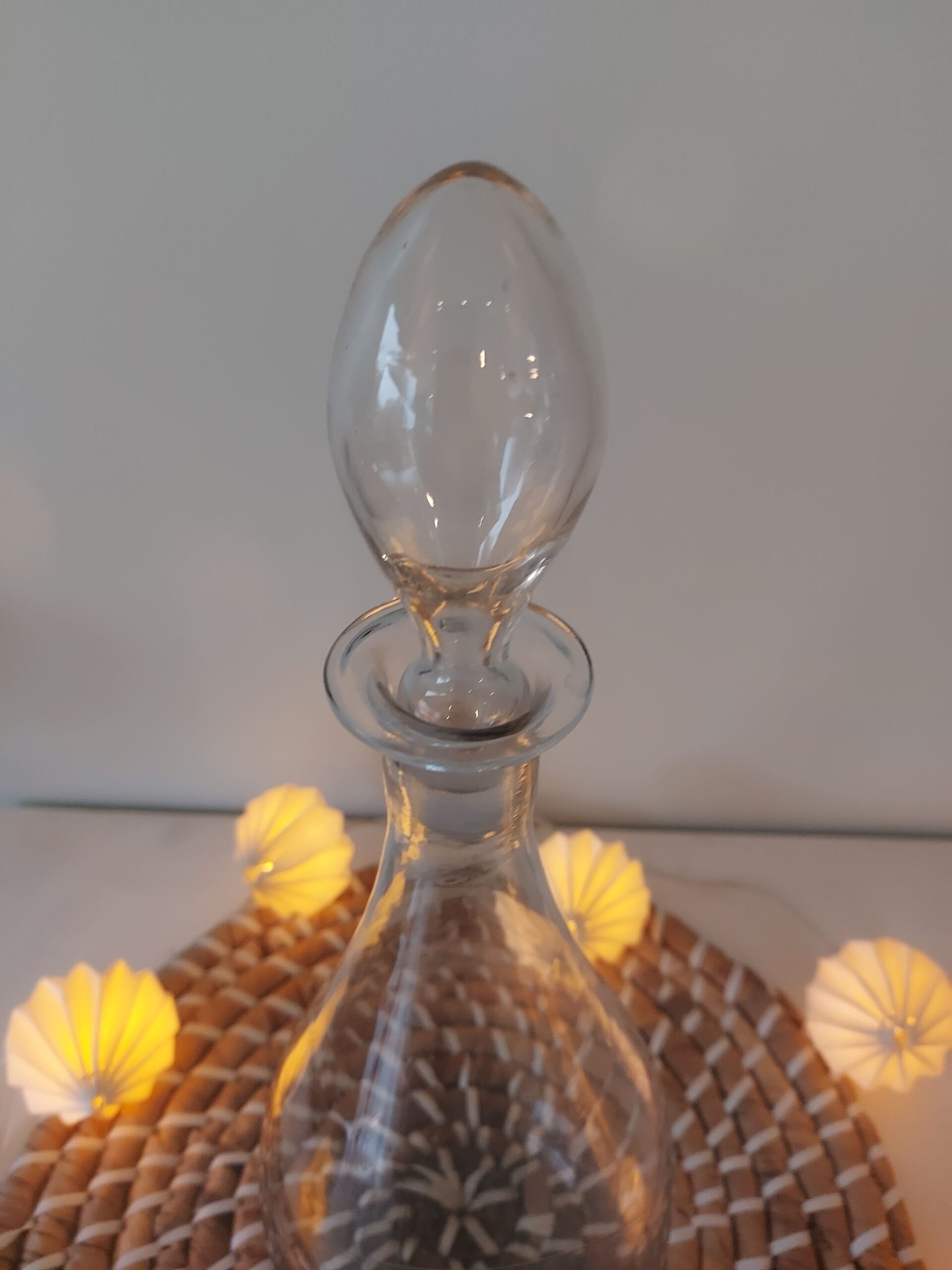 Très belle carafe en verre transparent, ornée de délicats motifs floraux gravés à la main.