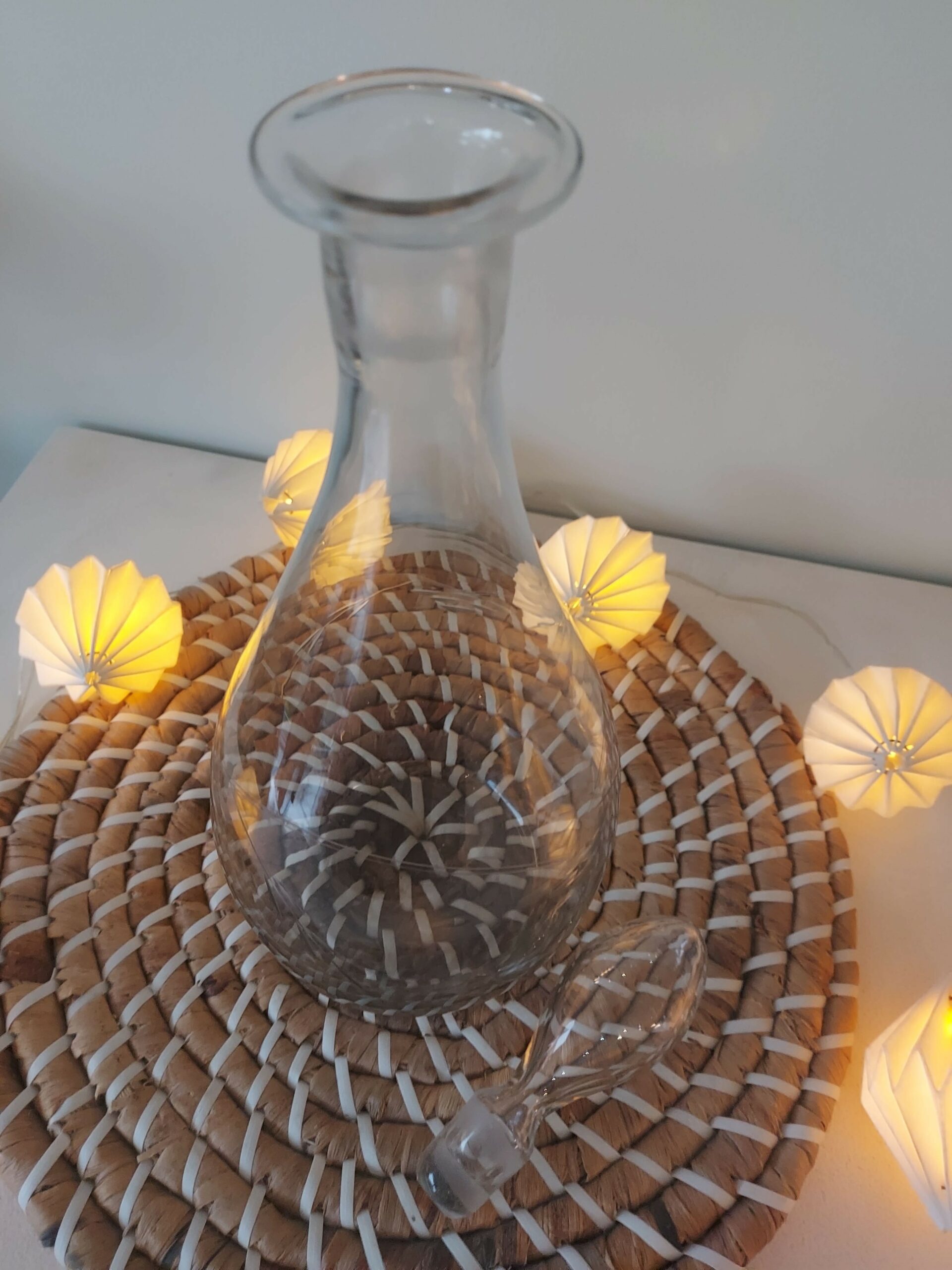 Carafe en verre transparente gravée avec bouchon, style déco vintage, motifs floraux gravés à la main, forme en goutte d’eau