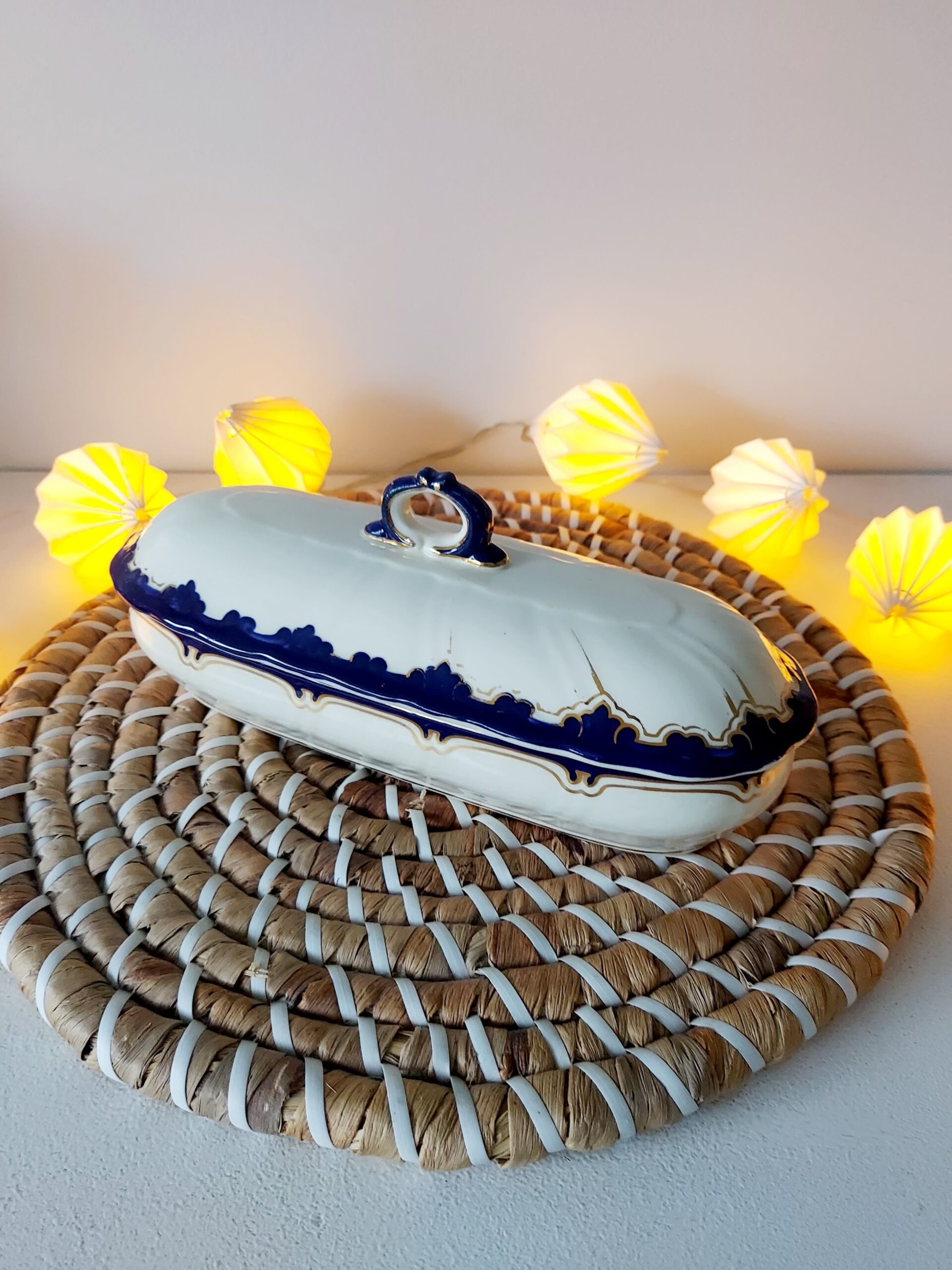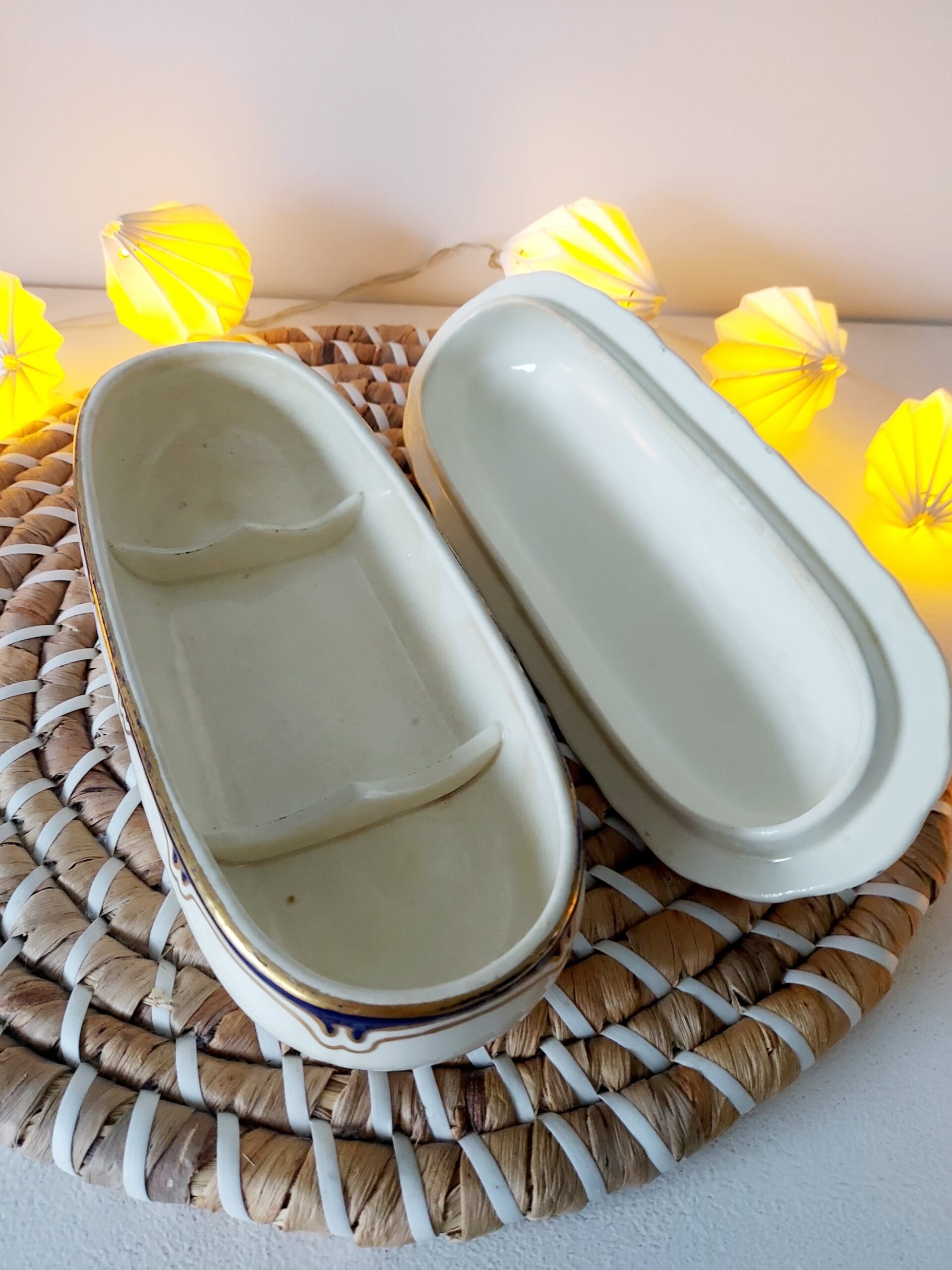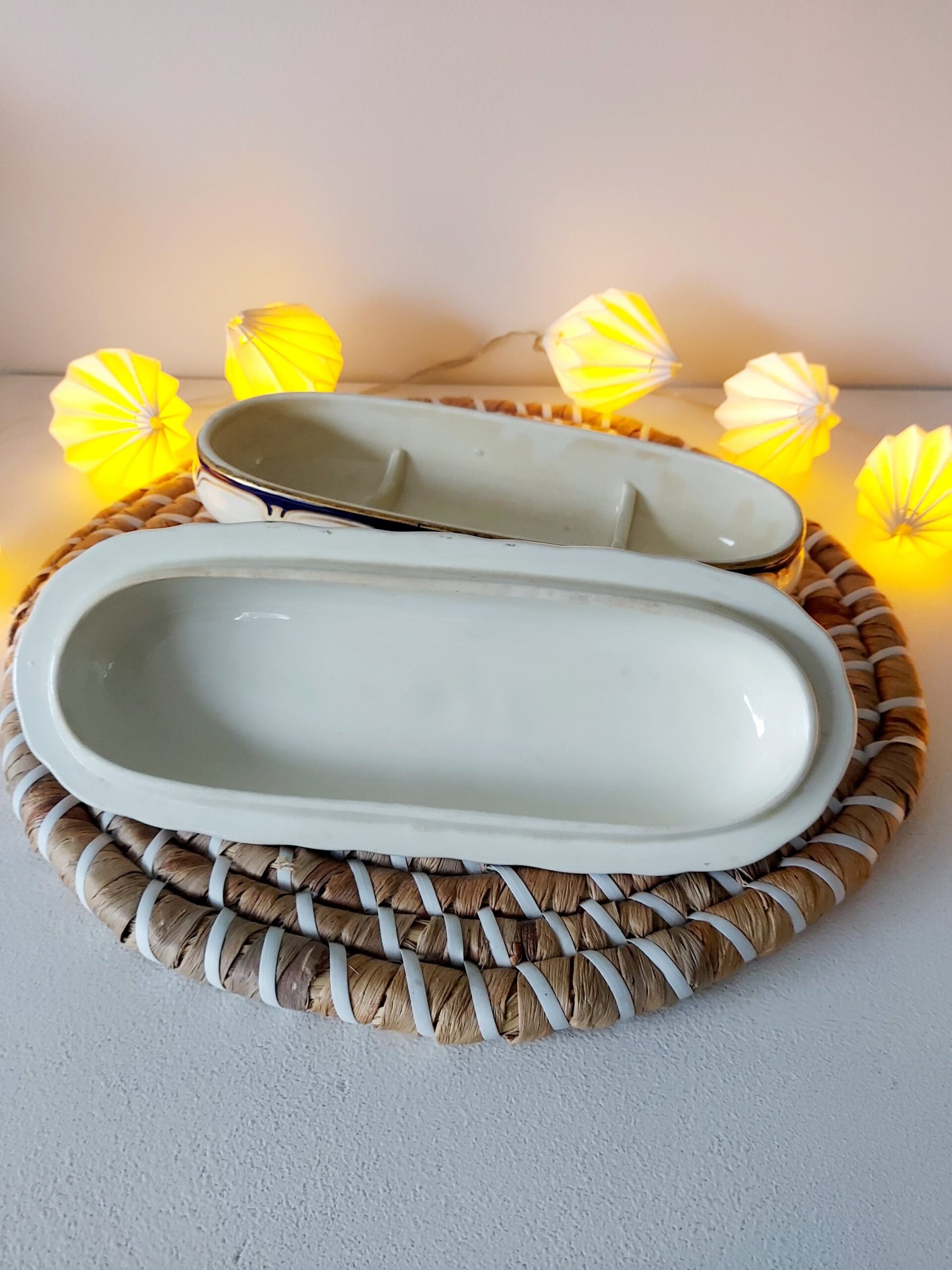Très joli coffret de toilette en faïence ancien années 30/50 décor bleu cobalt et or en bon état général. Marqué N.K.