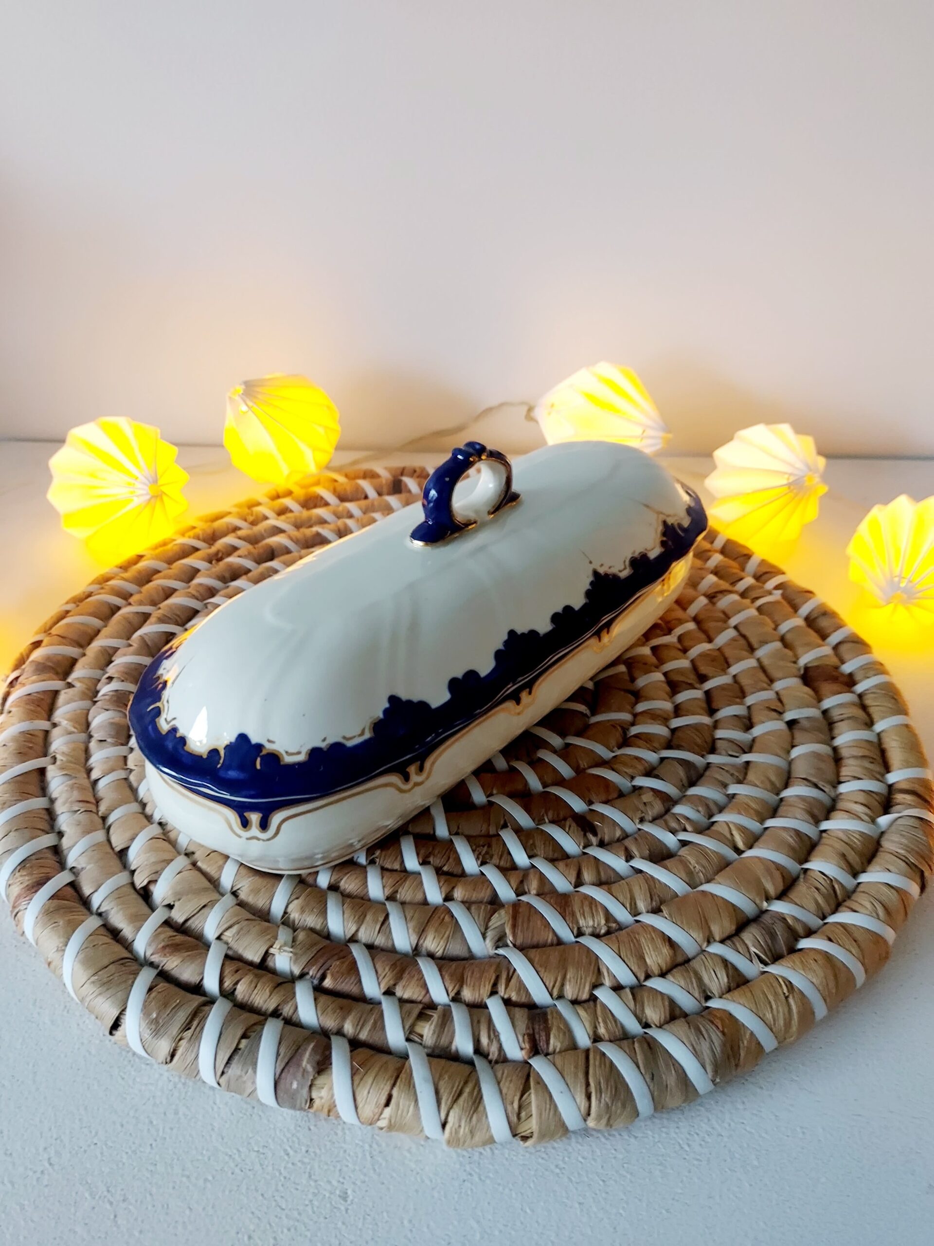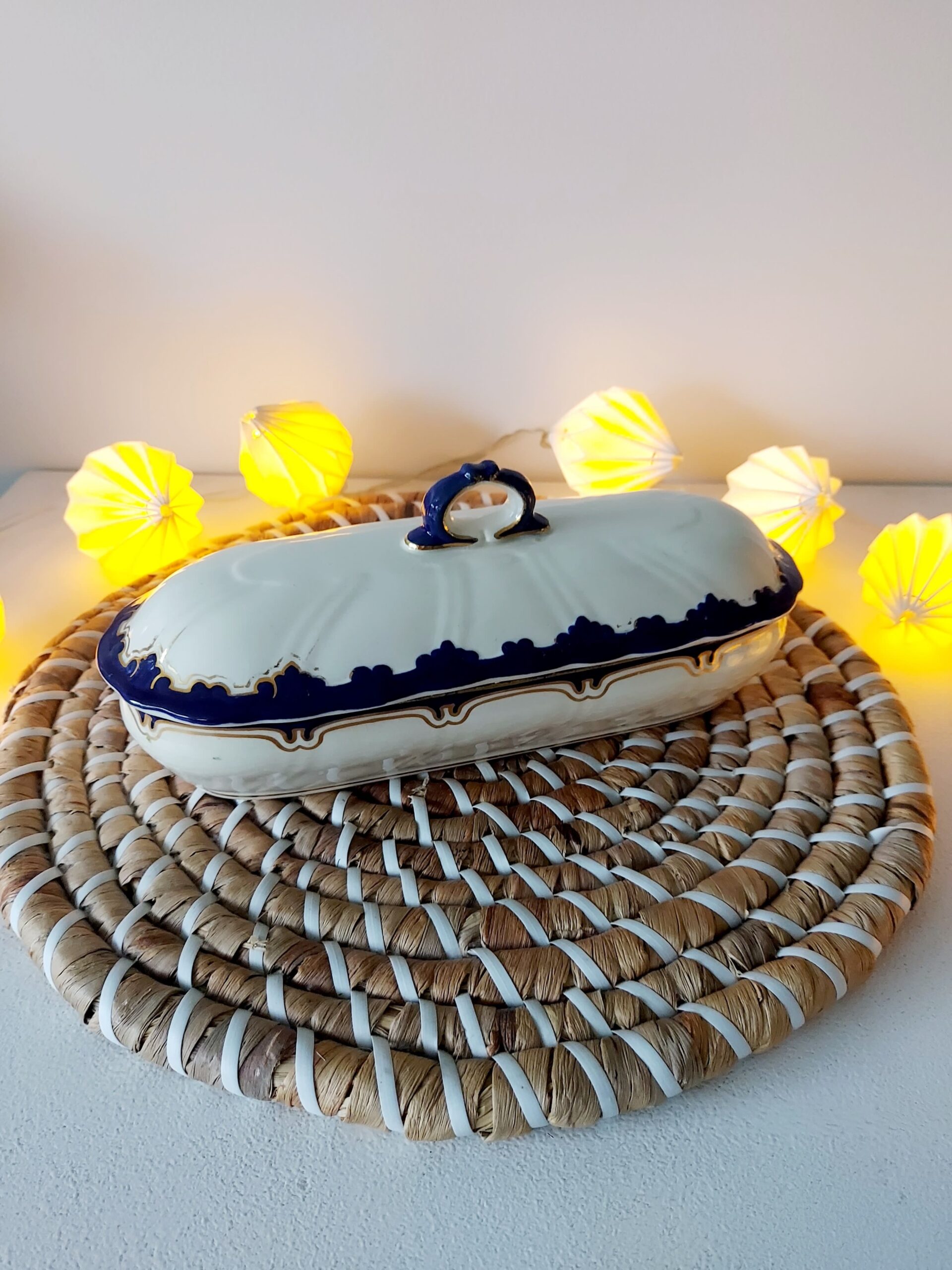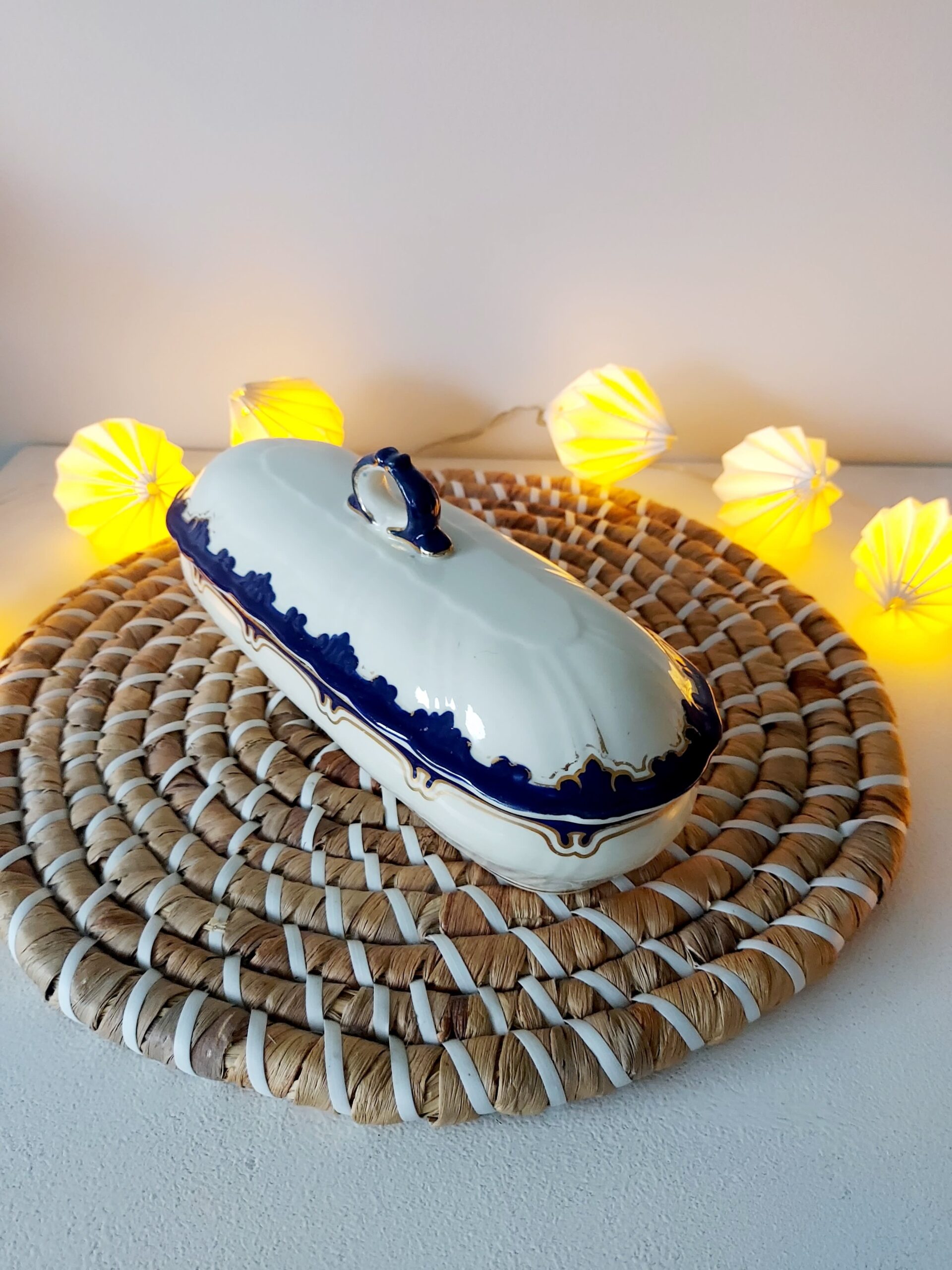 Très joli coffret de toilette en faïence ancien années 30/50 décor bleu cobalt et or en bon état général. Marqué N.K.