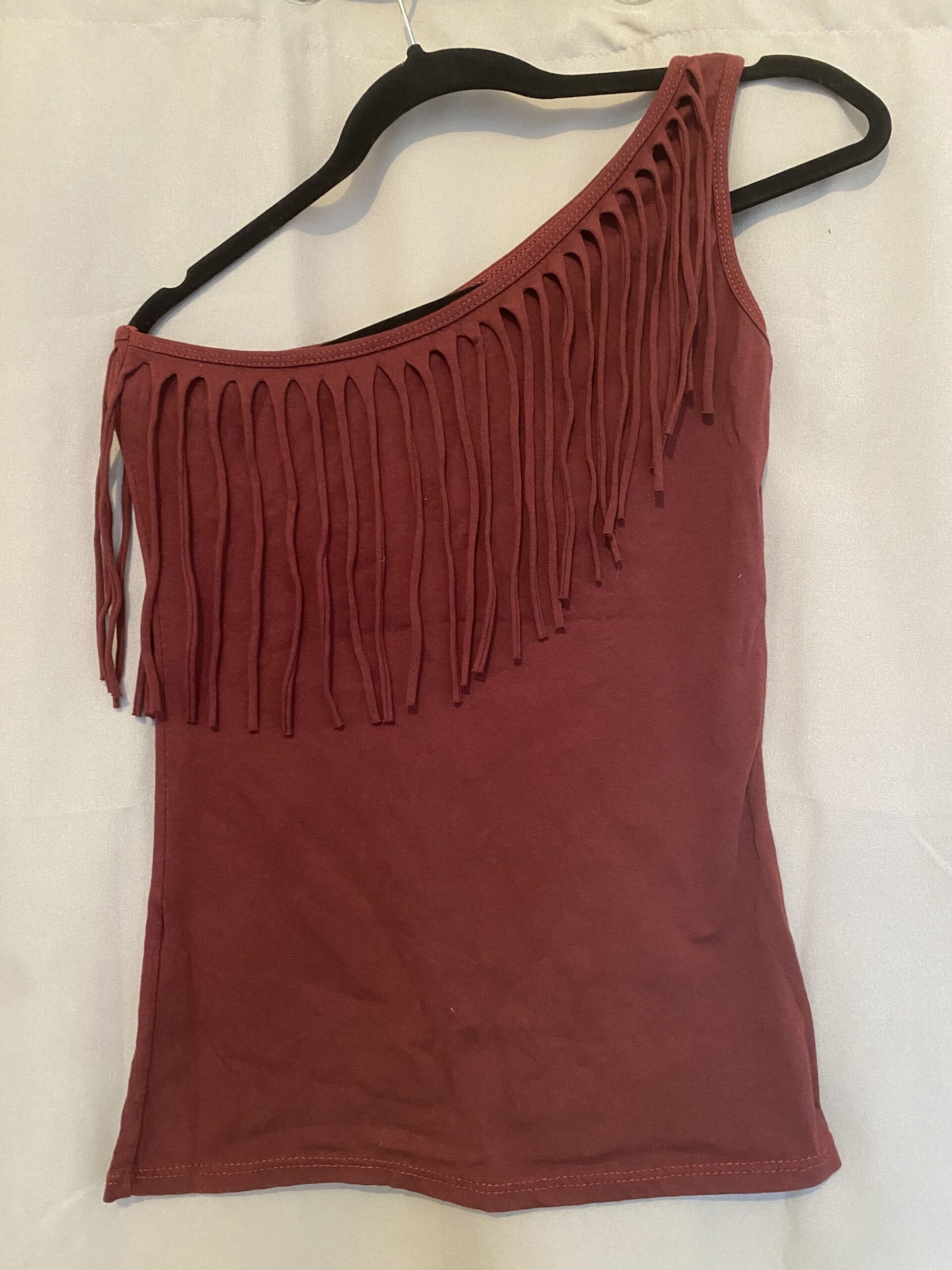 Débardeur asymétrique bordeaux avec franges au niveau du col taille S