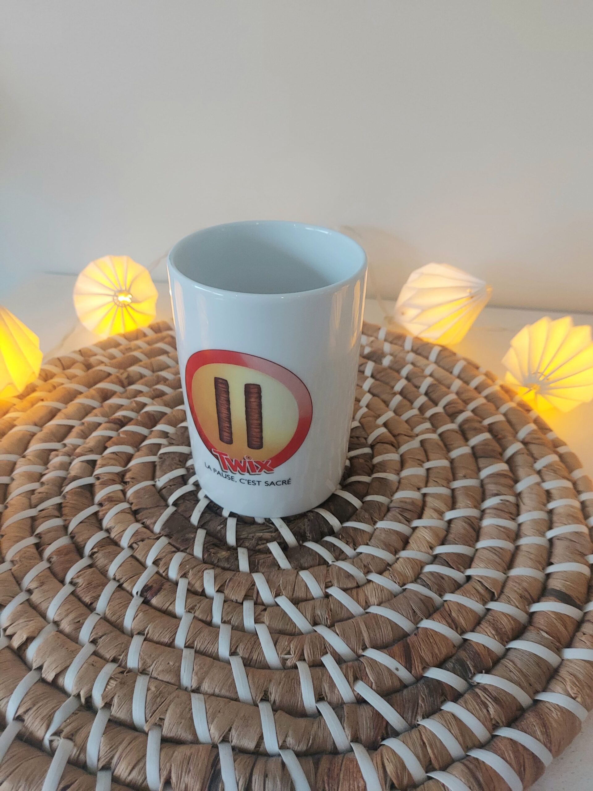 Mug publicitaire Twix en céramique blanche, avec logo et slogan « La pause, c’est sacré ».