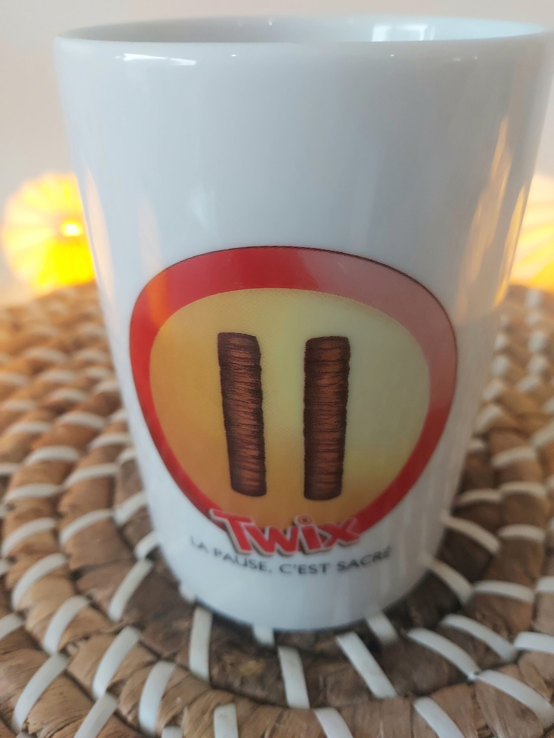 Mug publicitaire Twix slogan « La pause, c’est sacré » céramique blanche, objet promotionnel vintage, collection