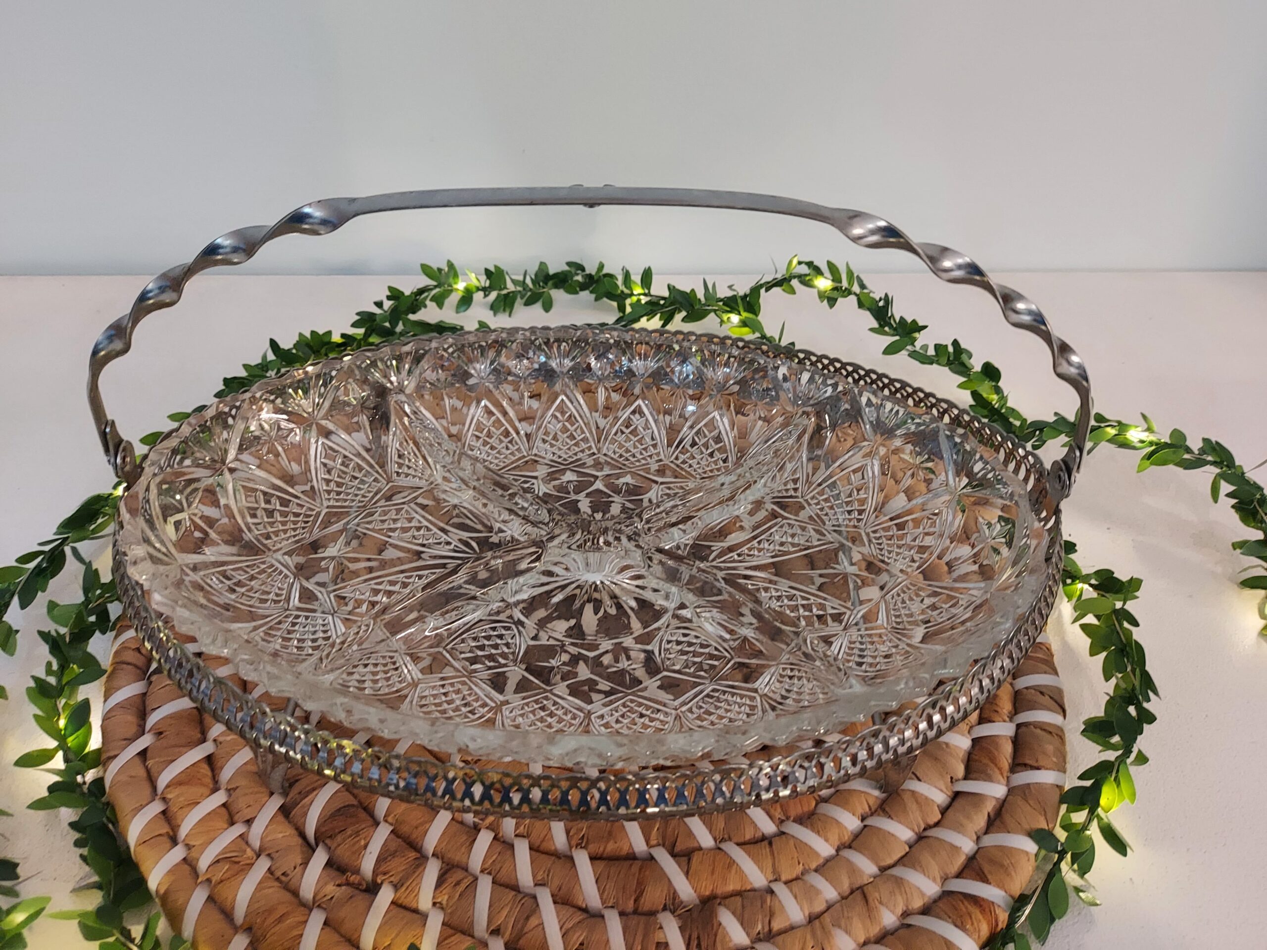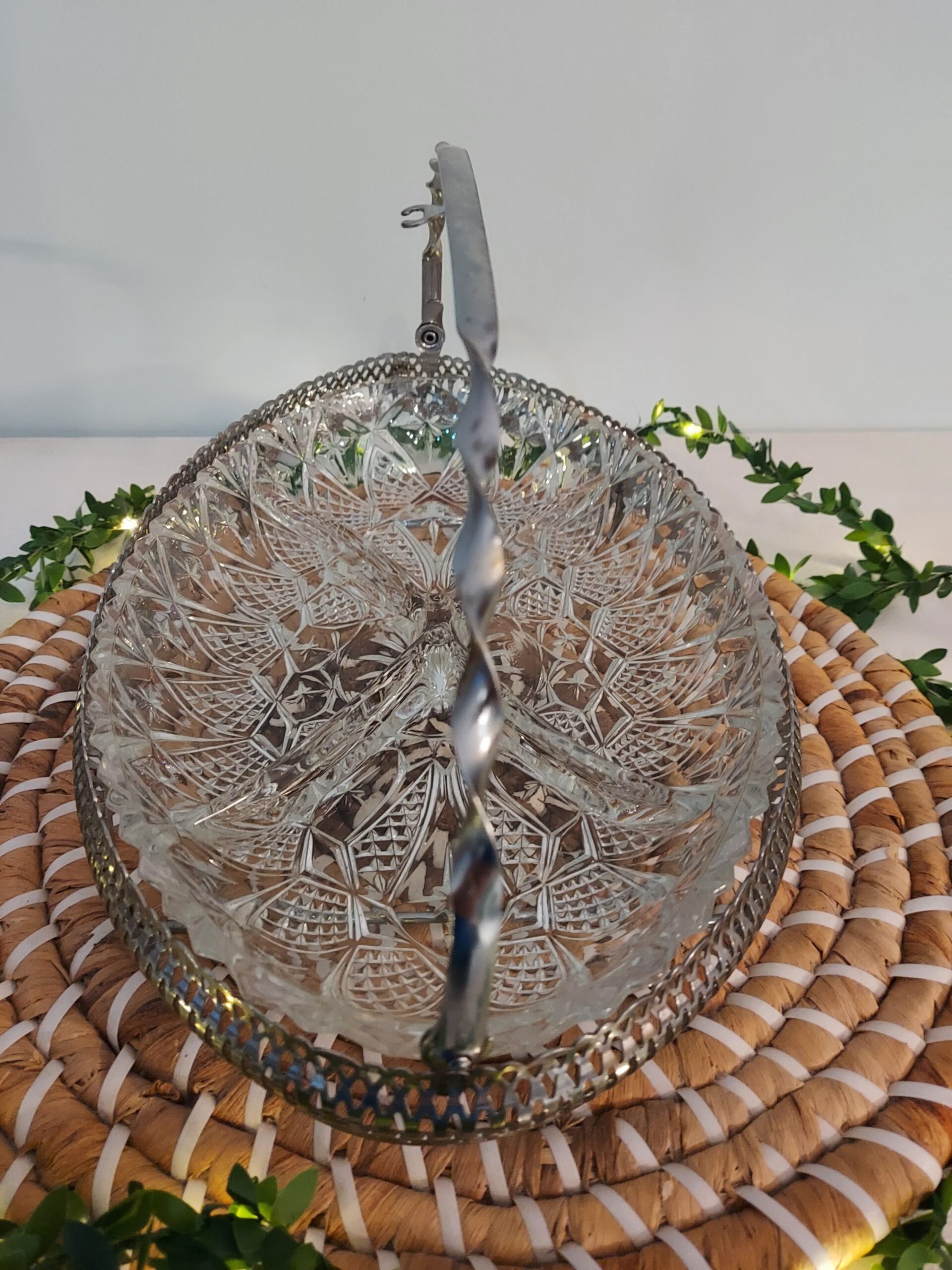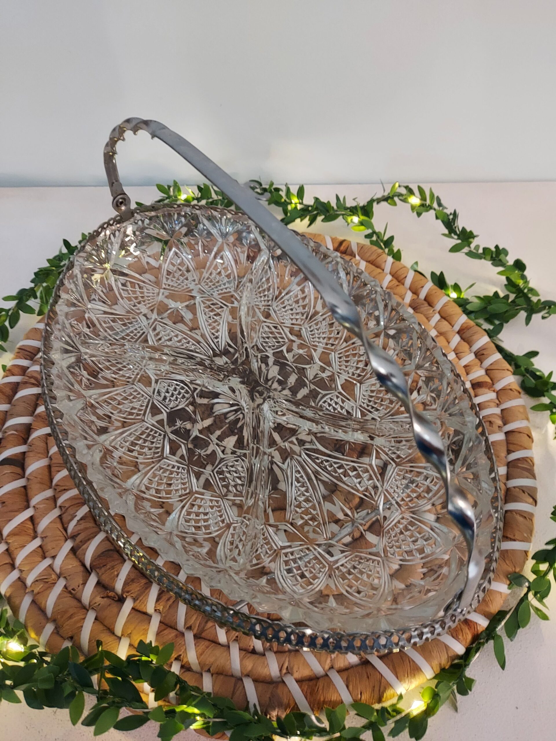 Très joli plat de service à hors d’oeuvre en verre taillé doté d’un support type panier de transport en métal argenté.