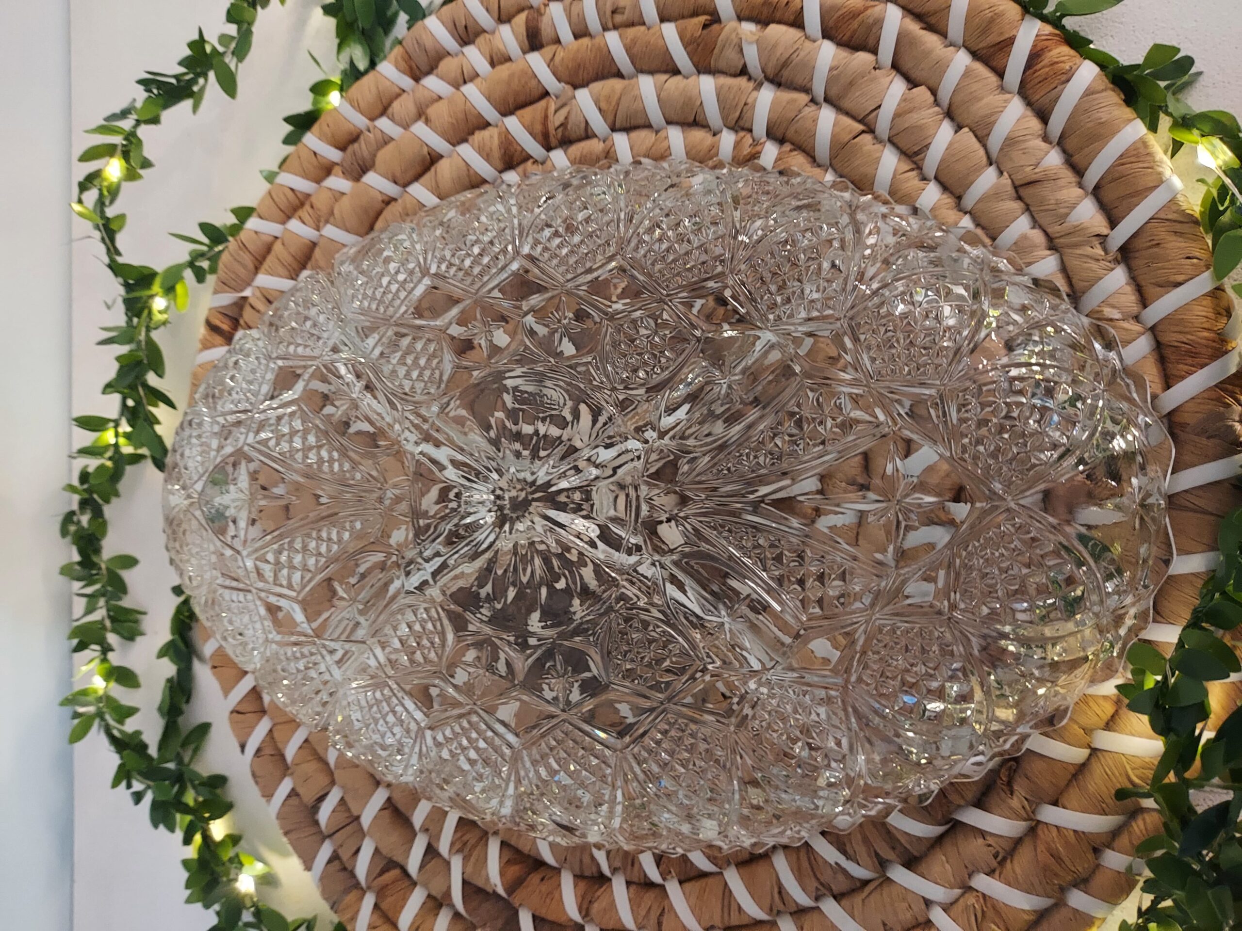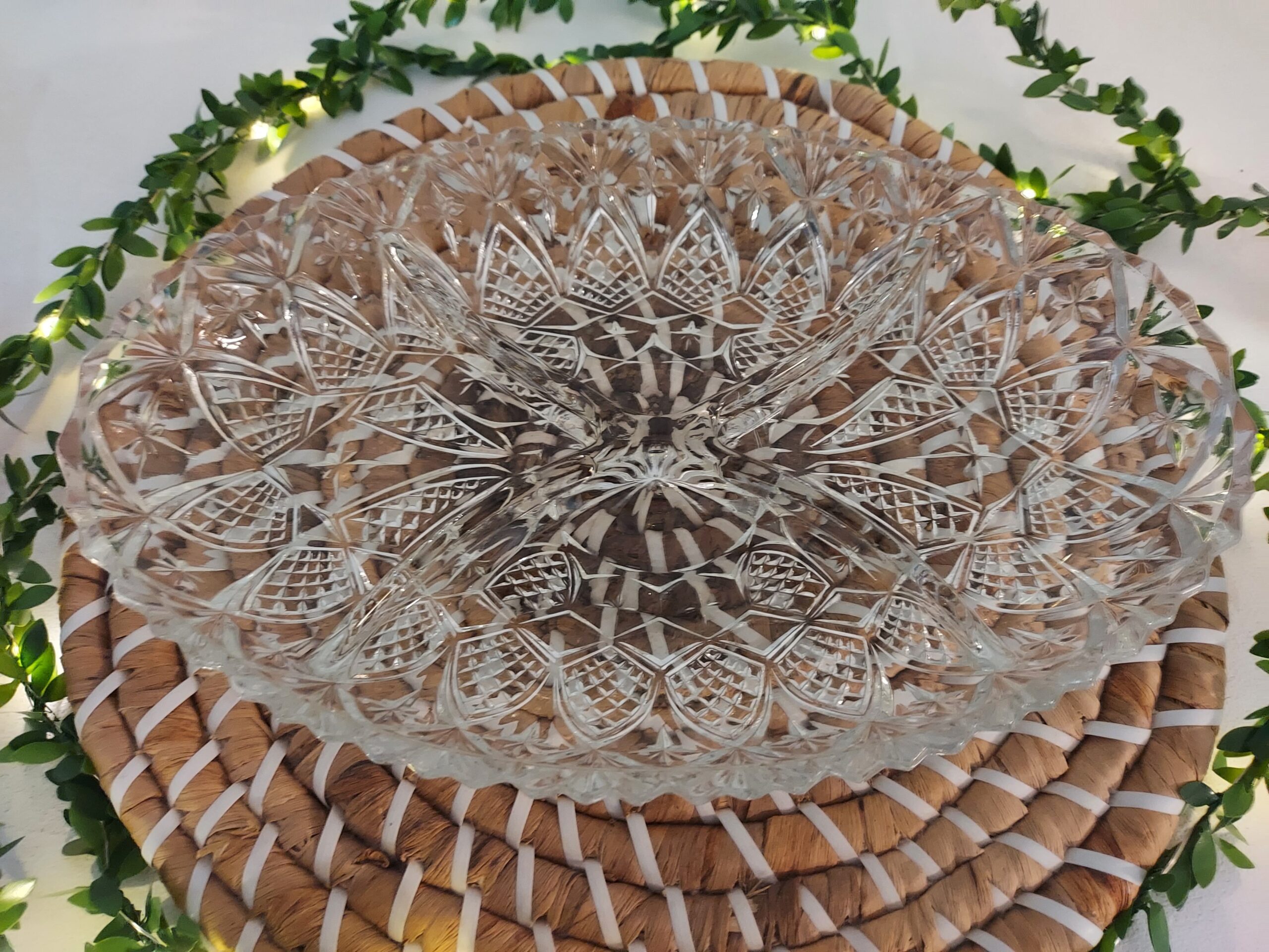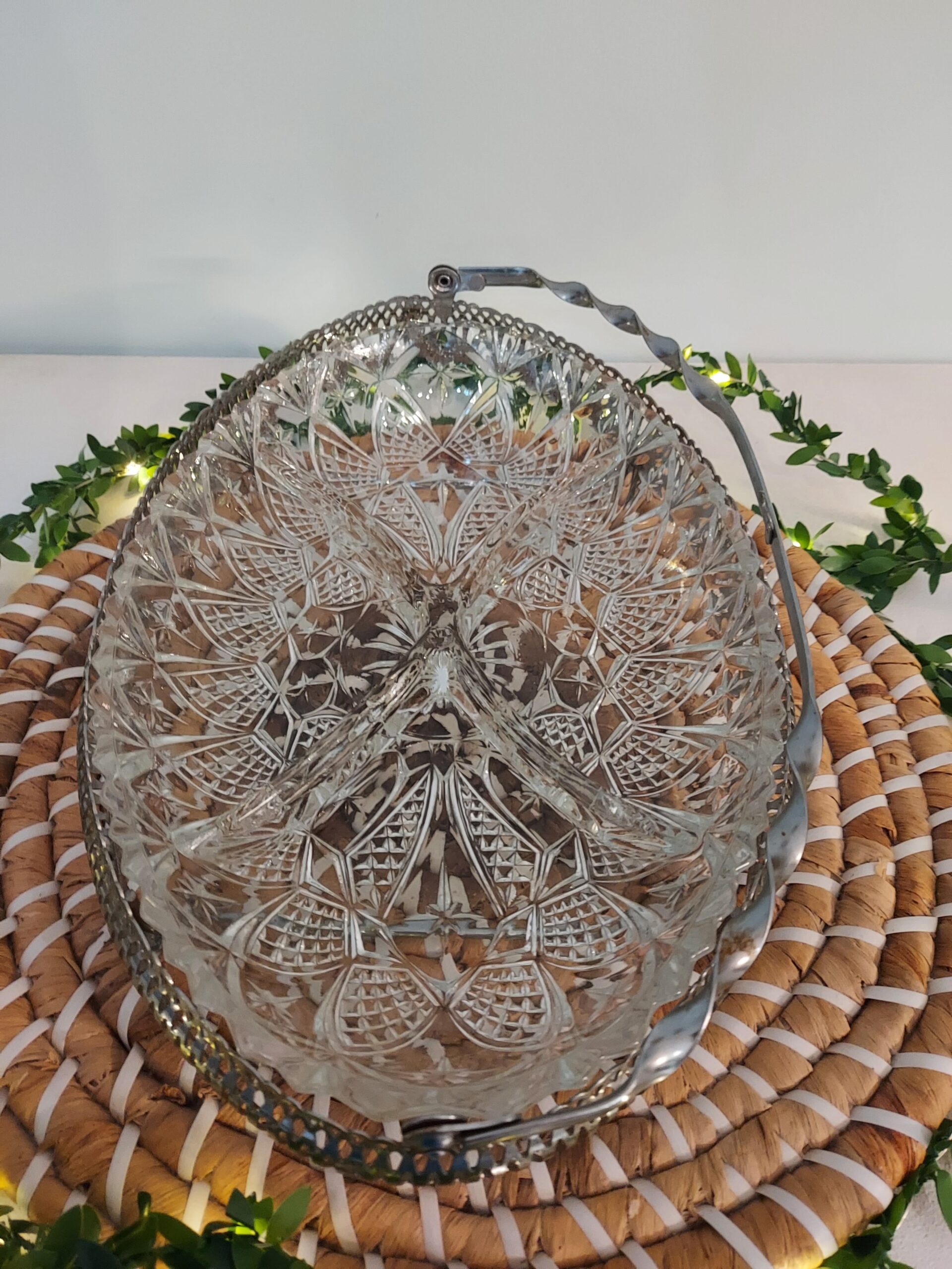 Très joli plat de service à hors d’oeuvre en verre taillé doté d’un support type panier de transport en métal argenté.