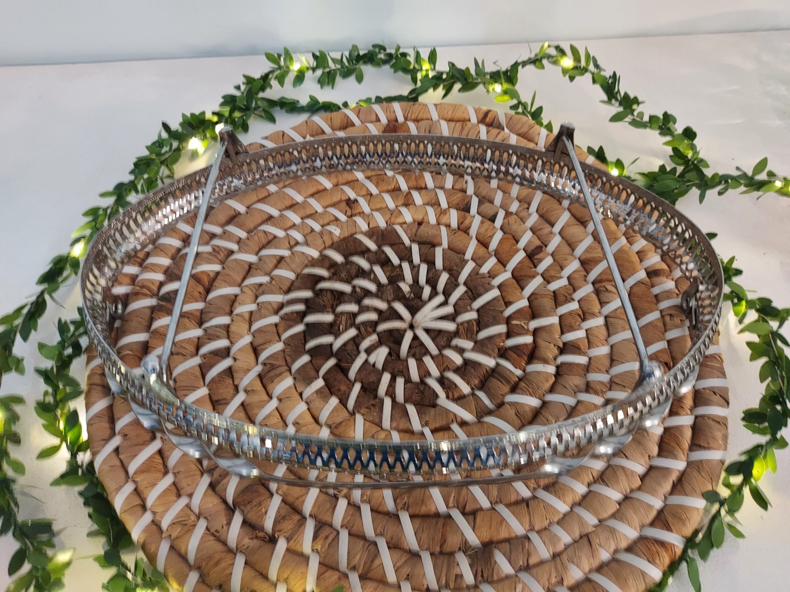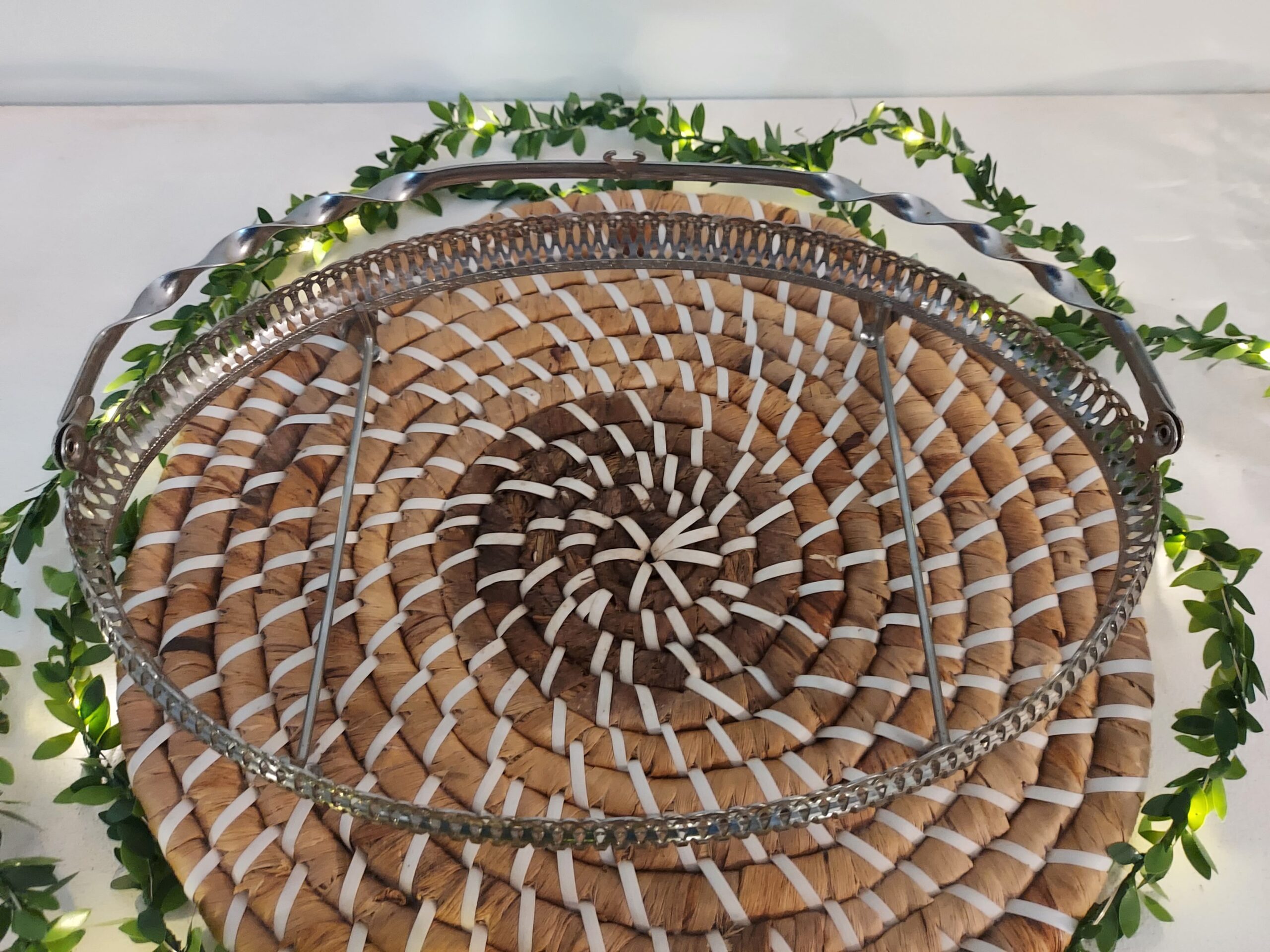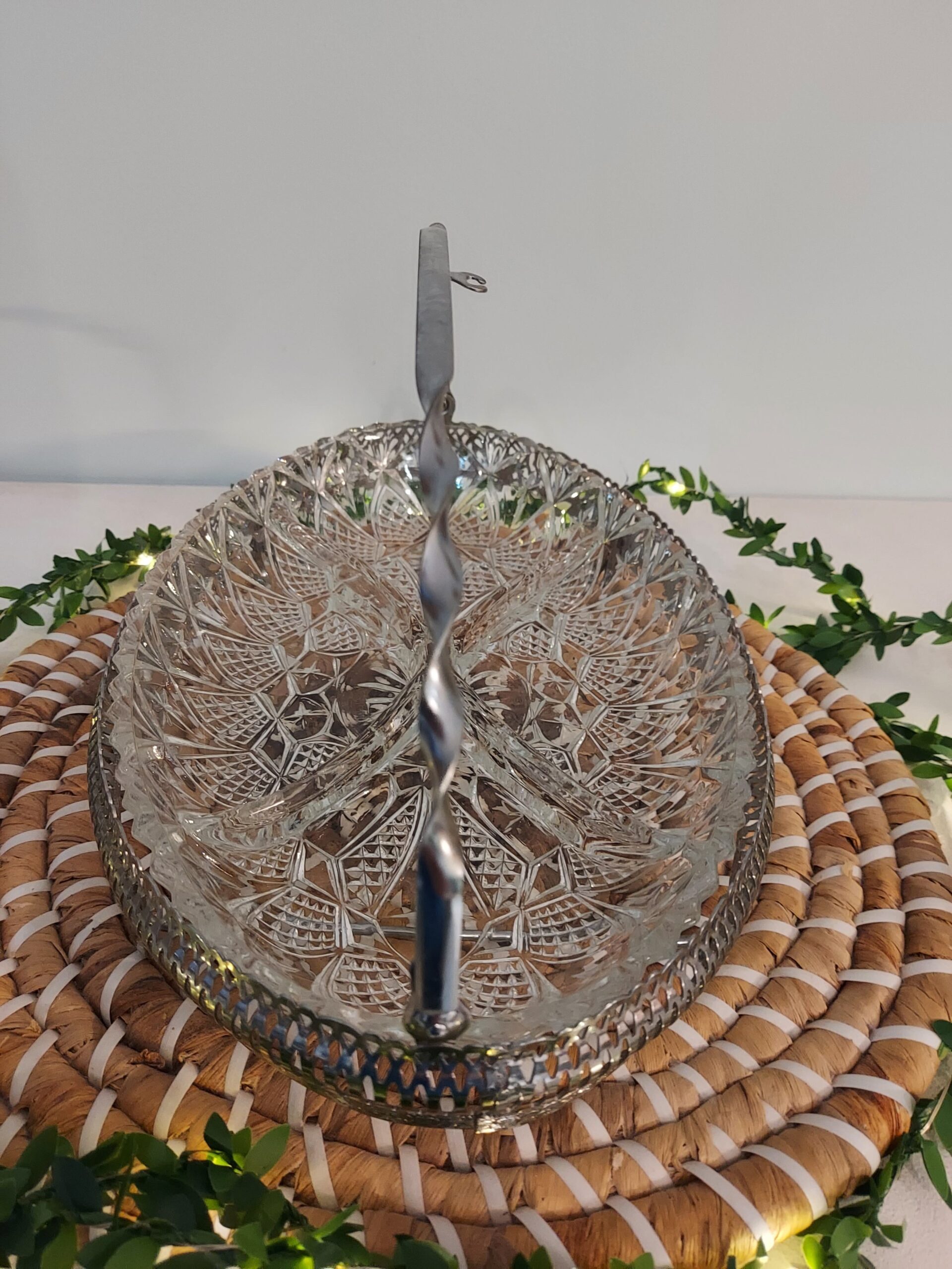 Plat de service à hors d’oeuvre vintage en verre avec panier en métal argenté années 80