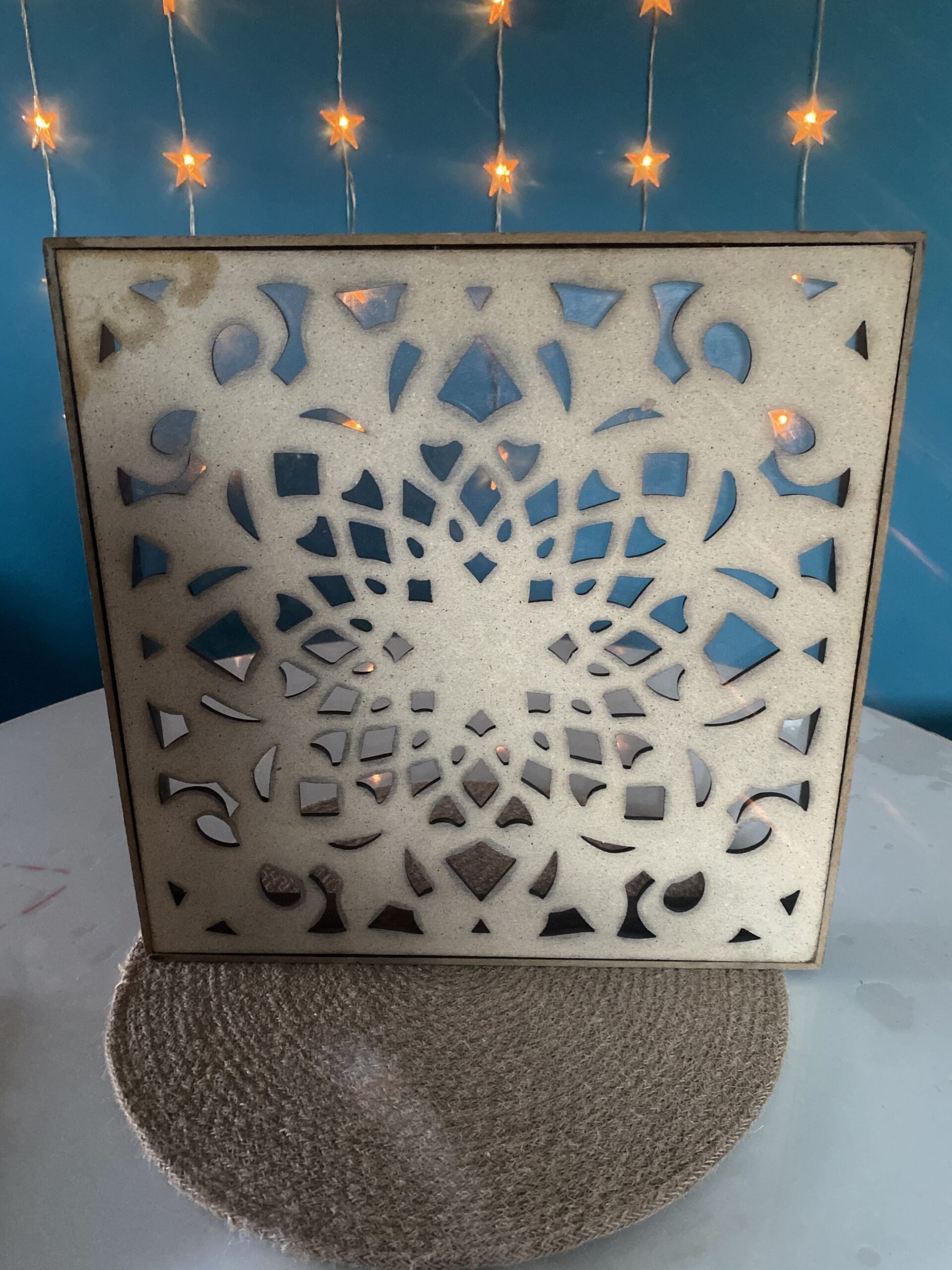 Plateau en bois noir carré avec plaque de plexiglas et motif mandala
