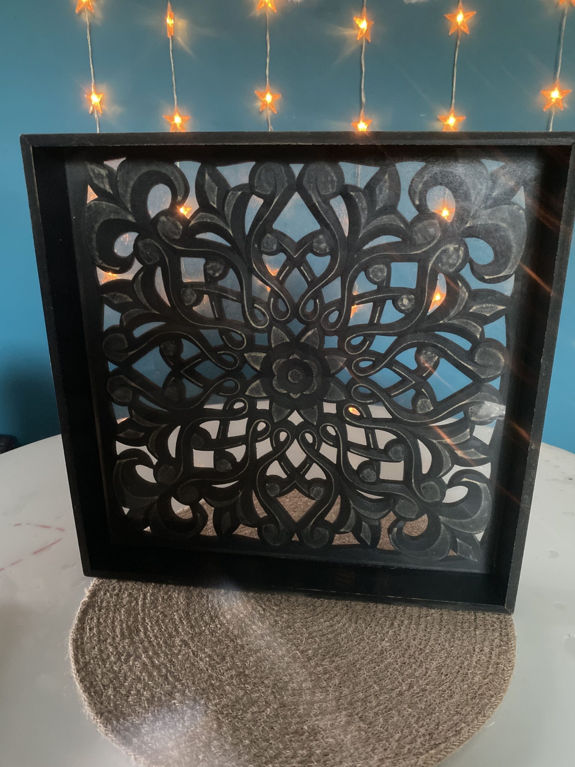 Très joli plateau noir en bois avec plaque de plexiglas et motif mandala