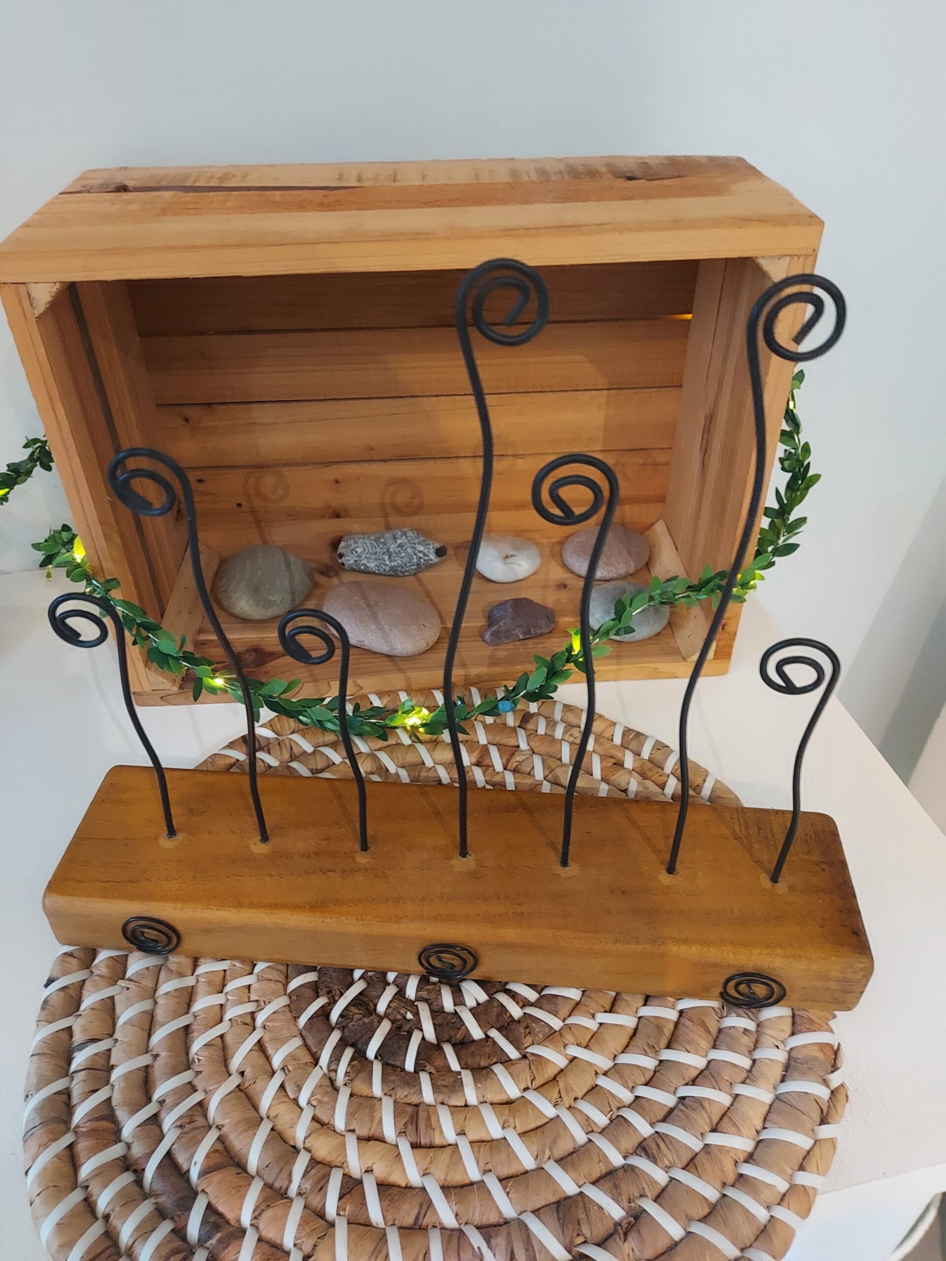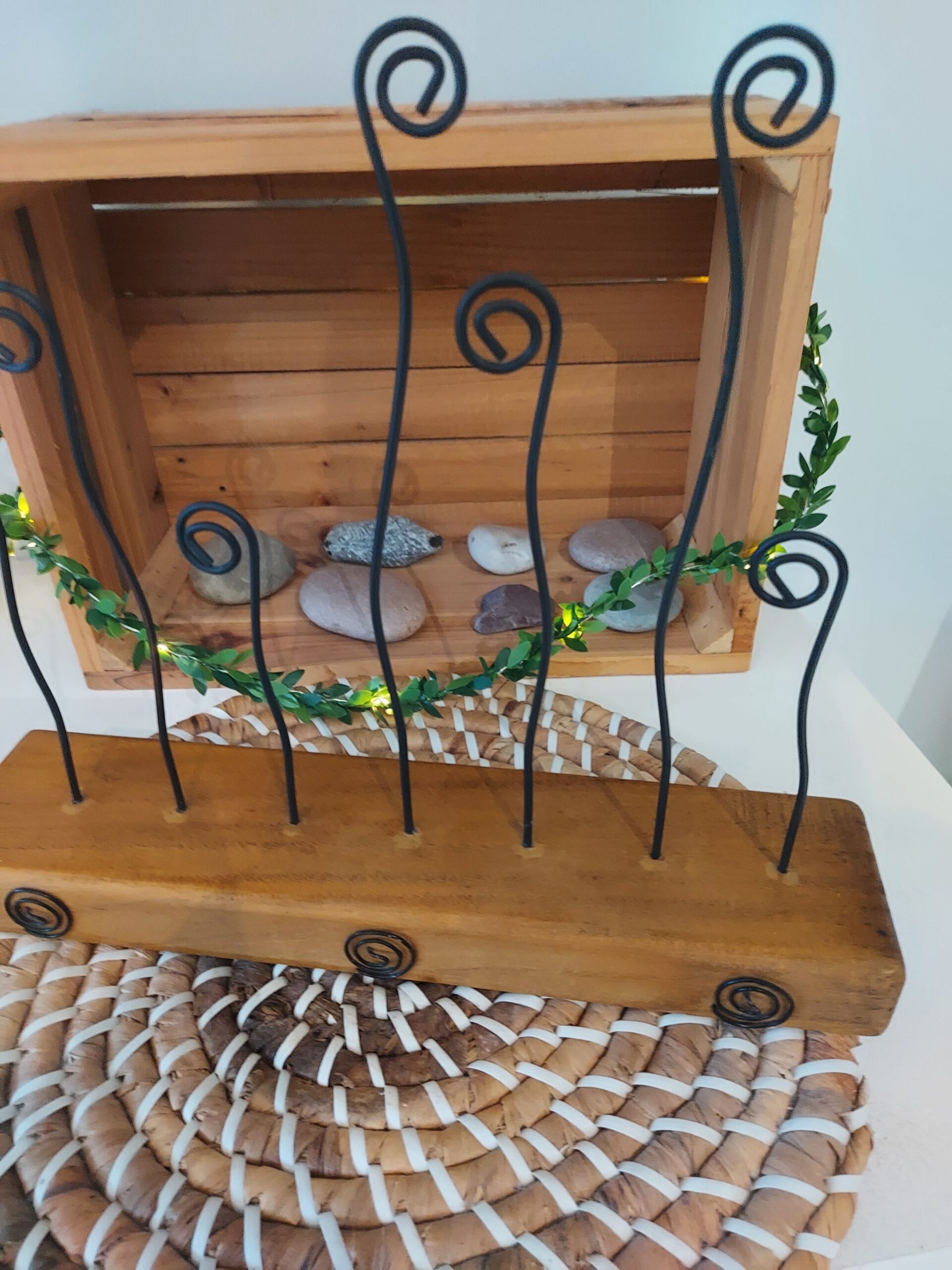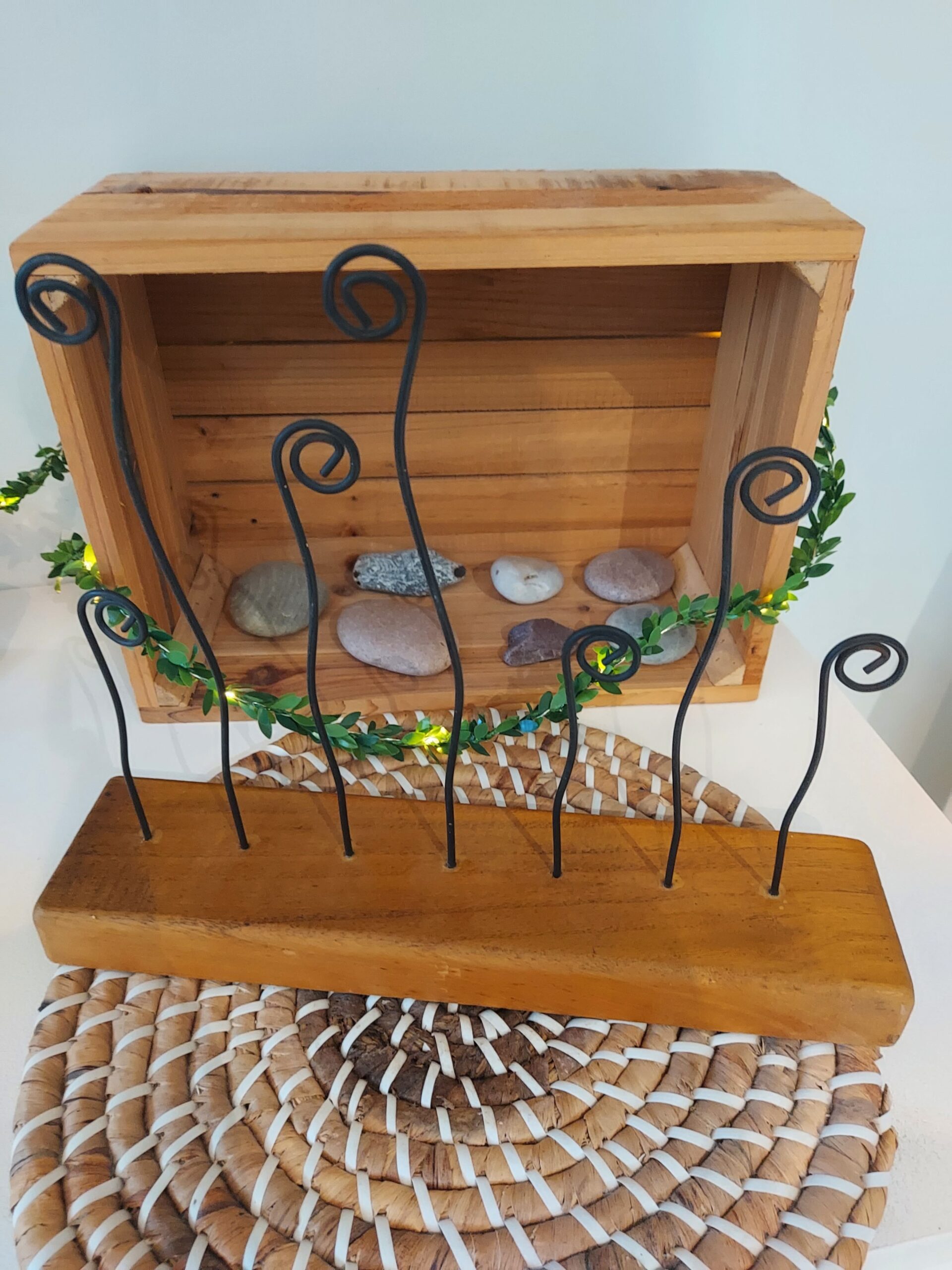 Joli porte-photo avec socle en bois et tiges torsadées en métal noir.