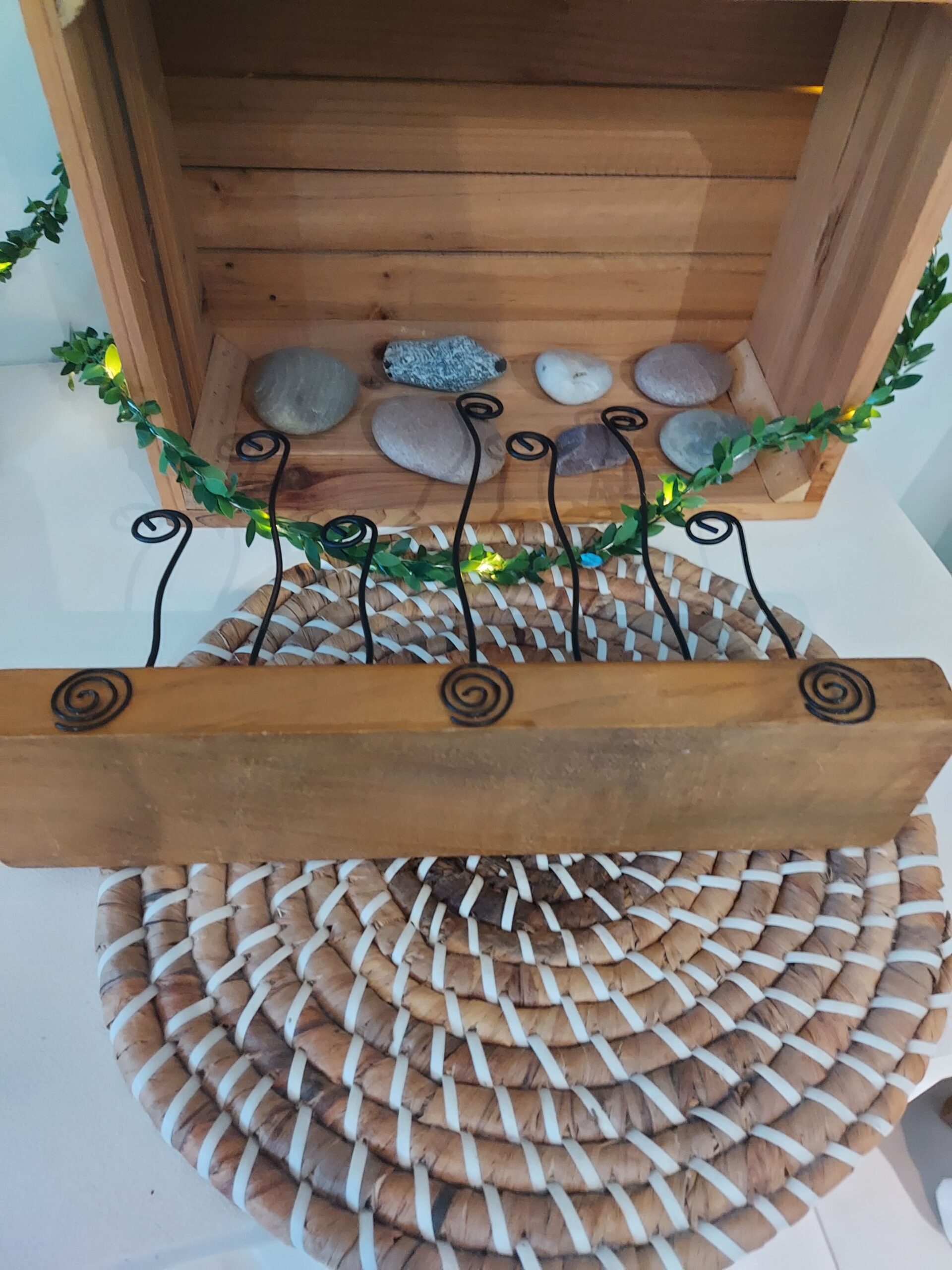 Porte-photo socle en bois et tiges torsadées métal noir capacité sept photos