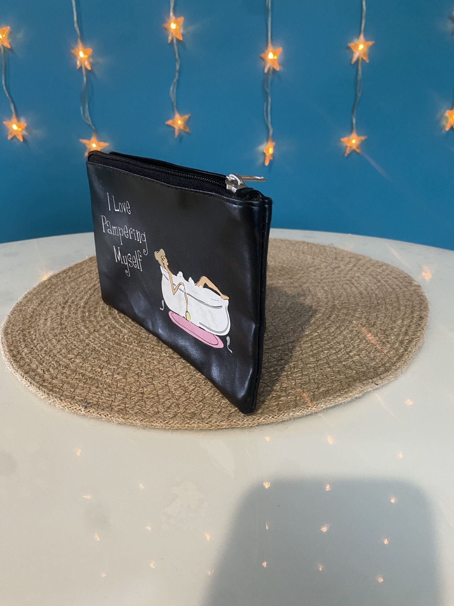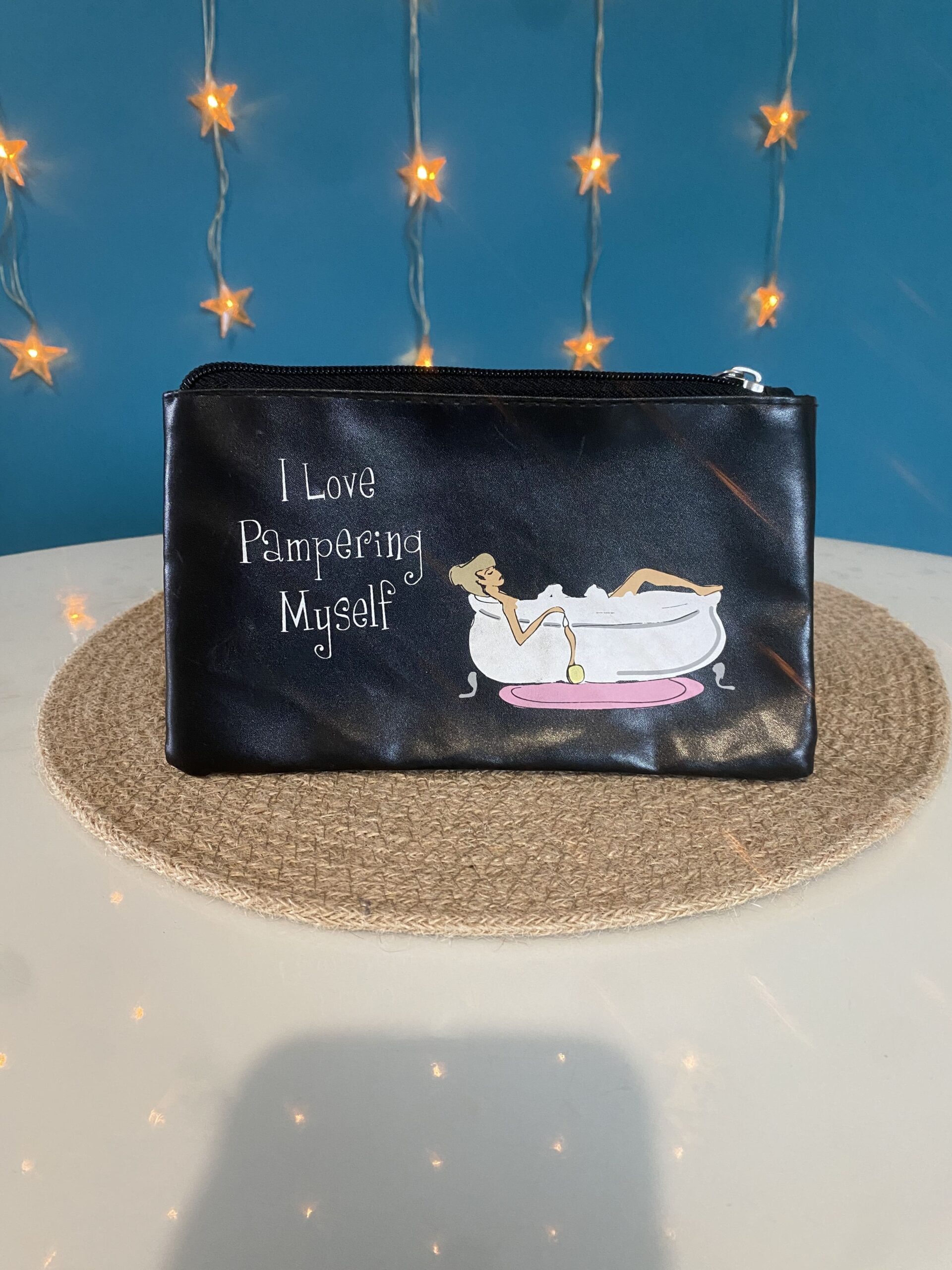 Trousse à maquillage noire « J’adore prendre soin de moi » en anglais, dessin de femme dans une baignoire